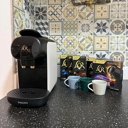 Ervaar ultiem comfort in de keuken van Palma Beach Apartment, voorzien van een koffie/theezetapparaat, een koelkast en een oven. De Placa d'Espanya stadsspoorweg is binnen een paar straten van het appartement.